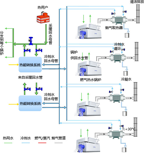 該項(xiàng)目采用雙良清潔能源集成系統(tǒng),在分析總結(jié)煙氣中水蒸汽冷凝率與排煙溫度的關(guān)系、冷凝率與熱效率的關(guān)系等研究結(jié)果的基礎(chǔ)上,采用雙良核心燃燒技術(shù)及超級(jí)冷凝技術(shù),將鍋爐排煙溫度降至30℃以下,充分吸收利用煙氣中的顯熱和水蒸汽凝結(jié)過程中釋放的汽化潛熱,大幅提高燃?xì)饫寐剩档凸嵯到y(tǒng)能耗,熱效率可達(dá)108%。