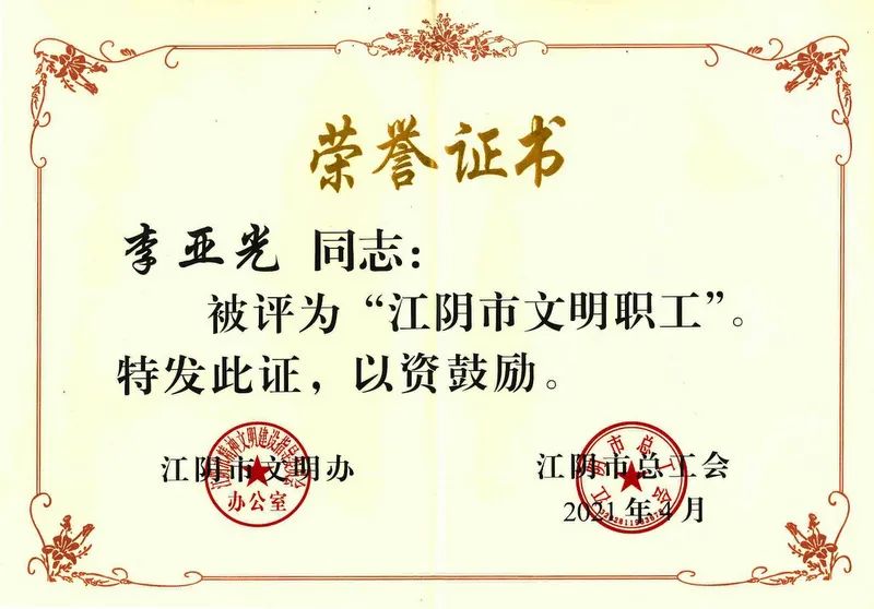 21年春,由江陰市精神文明建設指導委員會辦公室, 江陰市總工會聯(lián)合發(fā)起的評選中,江蘇雙良鍋爐有限公司李亞光獲評“江陰市文明職工”。這不是他第一次獲獎,1998年至2008年連續(xù)11年被評為“公司先進工作者”,2010年被評為“利港鎮(zhèn)先進工作者”、“集團能源管理先進工作者”,2014年被評為“集團十佳員工”,2015年被評為“江陰市優(yōu)秀職工”,“空氣壓縮機管路改進”獲評“臨港經(jīng)濟開發(fā)區(qū)合理化建議一等獎”,2016年被評為“無錫市五一創(chuàng)新能手”;2017年液壓U型管水壓工裝獲評雙良集團2016年度十大合理化建議獎,2018年獲評2017年度利港工匠,液壓U型管水壓工裝獲評利港科技之星。